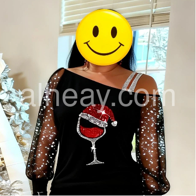 This elegant long-sleeved holiday Christmas shirt features a glittering print of a tipsy red wine glass with a Santa Claus hat, spreading the holiday cheer with a super-fun vibe, ready for par-tay good times! This black off-shoulder asymmetrical shirt features sheer long sleeves elevating this top to a luxe look for any date night. Machine wash cold tumble dry low to medium heat. Iron if needed or lay flat to dry.