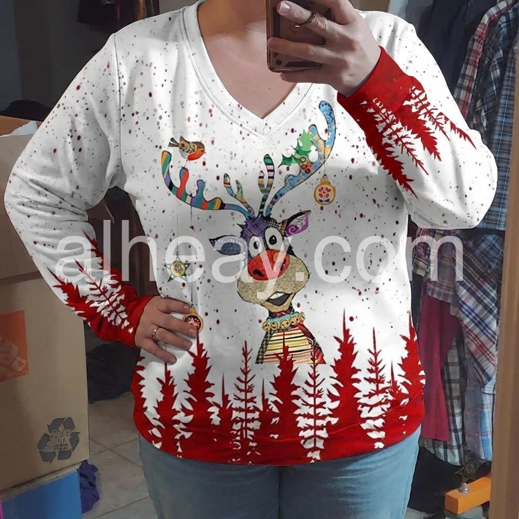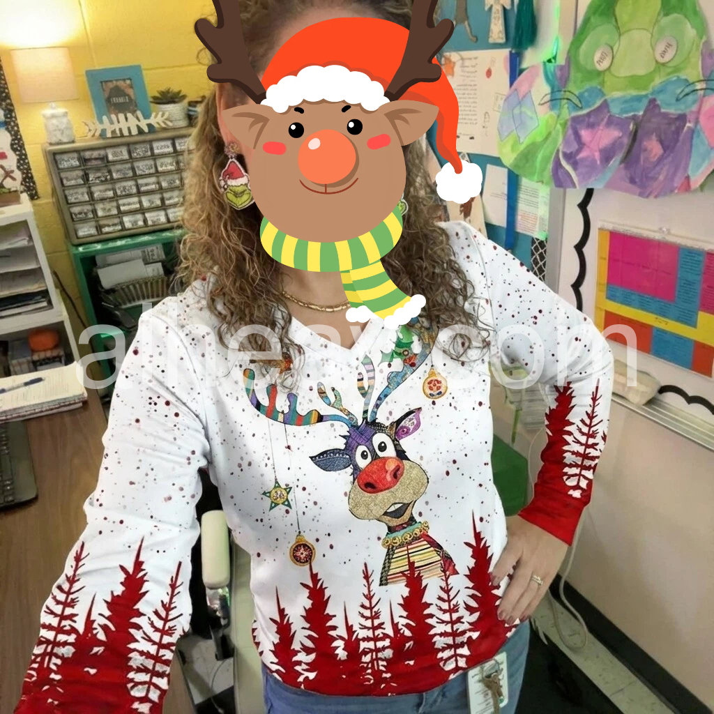 Spreading the cheer with Rudolph the Red Nosed Reindeer! This super-adorable Christmas top features a red and white pine tree/Christmas tree silhouette with a colorful Rudolph on the front. Long sleeves and a round collar top with a waist-length fit give this top the perfect coverage for cooler days and nights.